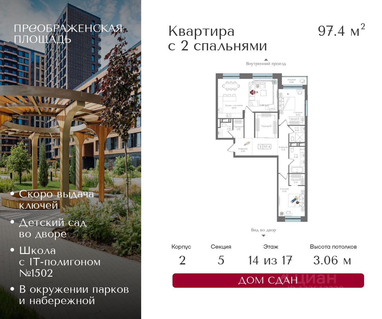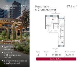 Квартира на 14 этаже в жилом комплексе премиум-класса "Преображенская площадь". Общая площадь: 97.4 кв.м.