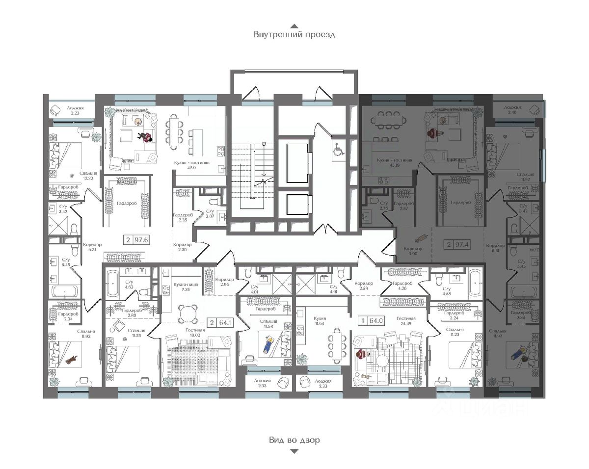 Внутренний двор 1,5 га функциональное и безопасное пространство для игр, работы и занятий спортом. Пешеходный променад для прогулок. Дома переменной этажности. Есть подземный паркинг.
