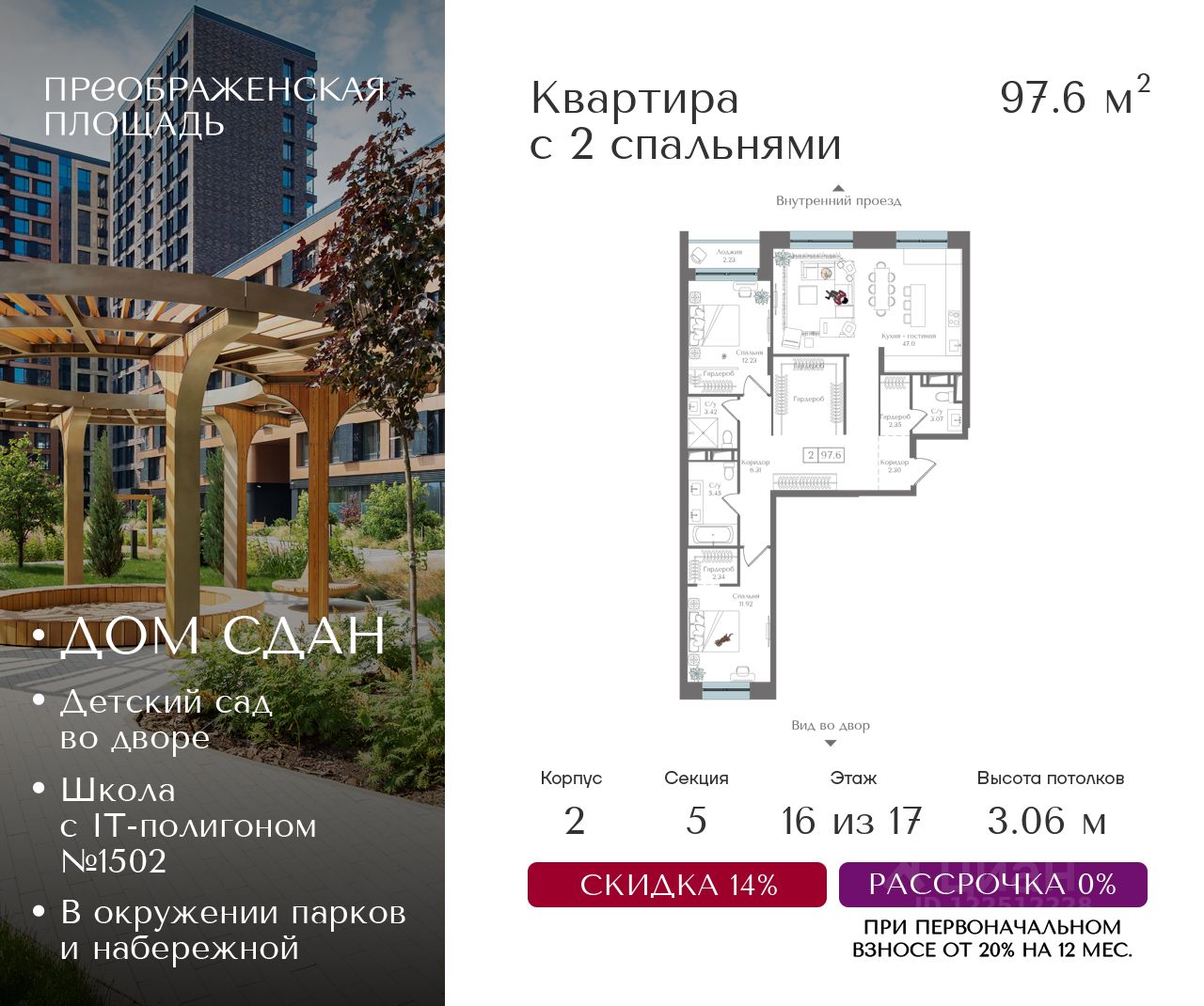 Квартира на 16 этаже в жилом комплексе премиум-класса "Преображенская площадь". Общая площадь: 97.6 кв.м.