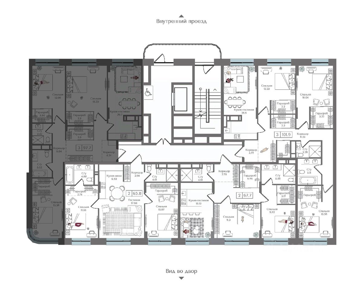 Внутренний двор 1,5 га функциональное и безопасное пространство для игр, работы и занятий спортом. Пешеходный променад для прогулок. Дома переменной этажности. Есть подземный паркинг.