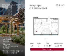 Квартира на 6 этаже в жилом комплексе премиум-класса "Преображенская площадь". Общая площадь: 67.8 кв.м.