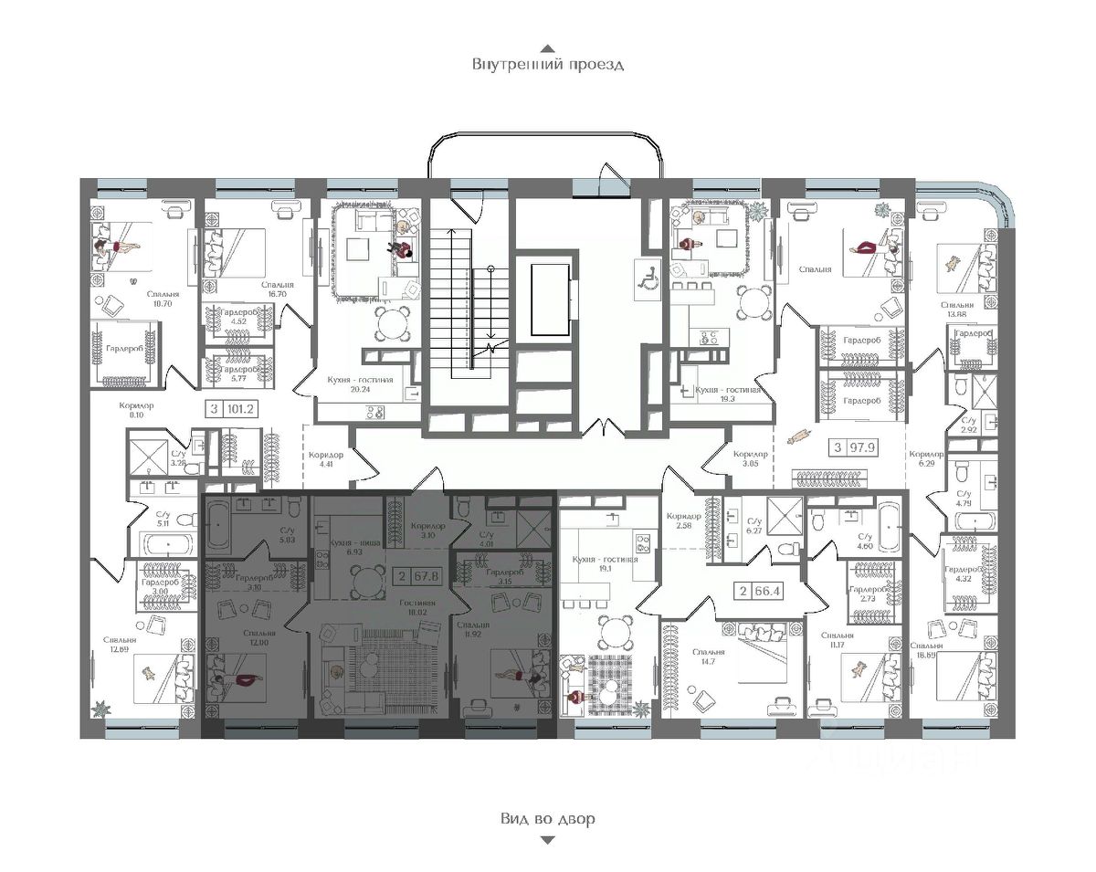 Внутренний двор 1,5 га функциональное и безопасное пространство для игр, работы и занятий спортом. Пешеходный променад для прогулок. Дома переменной этажности. Есть подземный паркинг.
