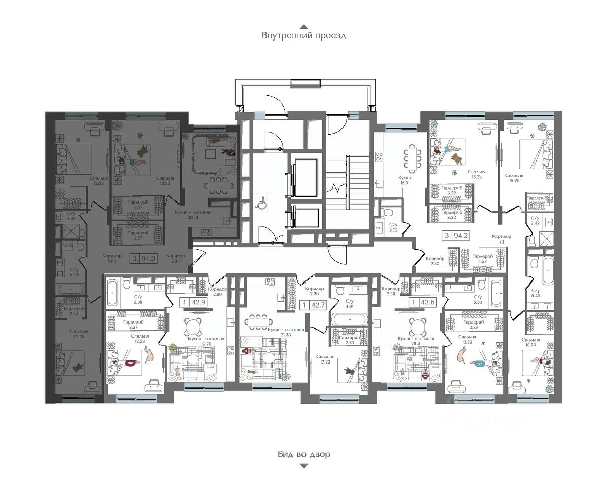 Внутренний двор 1,5 га функциональное и безопасное пространство для игр, работы и занятий спортом. Пешеходный променад для прогулок. Дома переменной этажности. Есть подземный паркинг.
