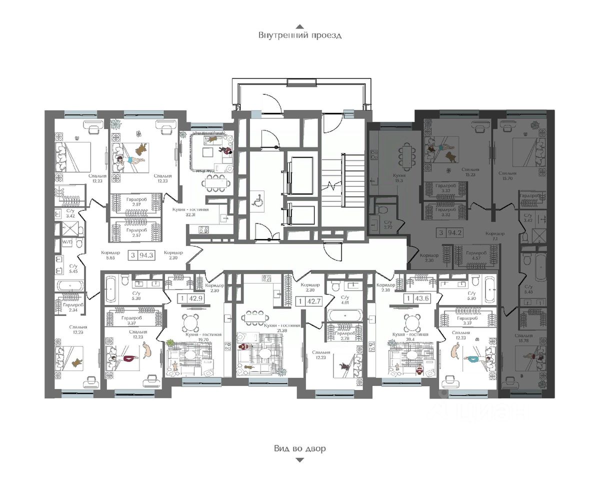 Внутренний двор 1,5 га функциональное и безопасное пространство для игр, работы и занятий спортом. Пешеходный променад для прогулок. Дома переменной этажности. Есть подземный паркинг.