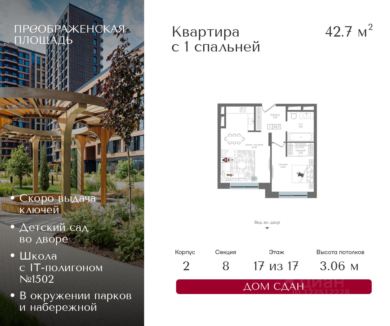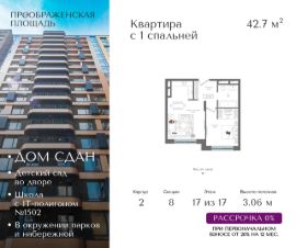 Квартира на 17 этаже в жилом комплексе премиум-класса "Преображенская площадь". Общая площадь: 42.7 кв.м.