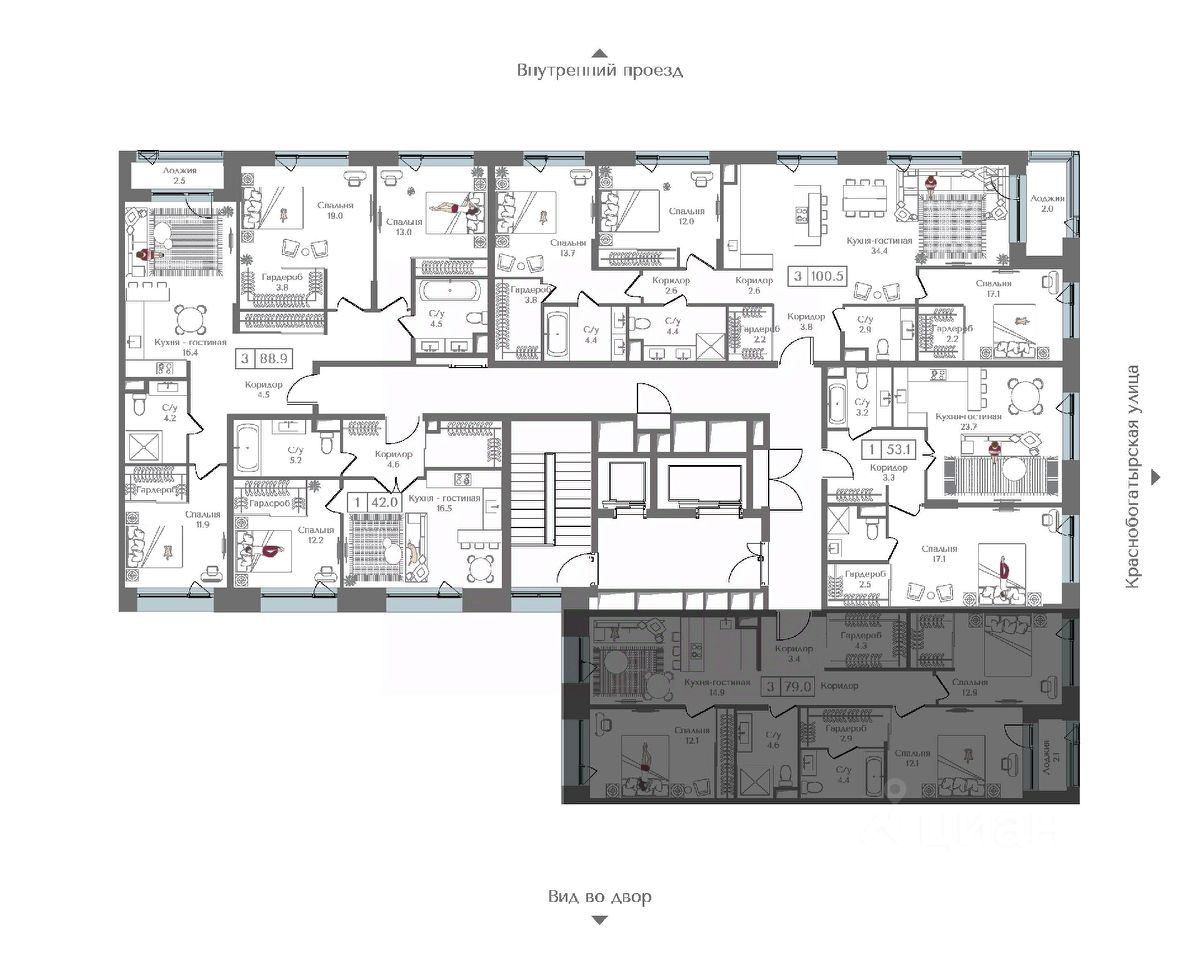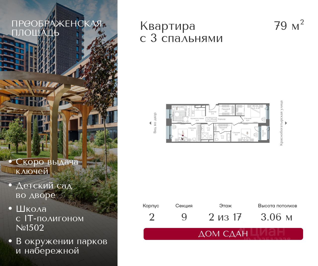 Квартира на 2 этаже в жилом комплексе премиум-класса "Преображенская площадь". Общая площадь: 79 кв.м.