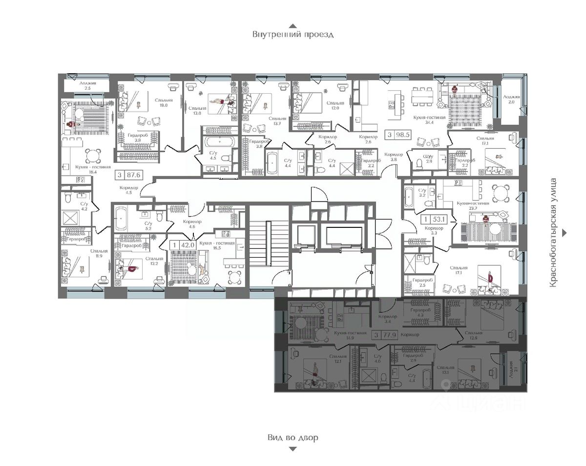 Внутренний двор 1,5 га функциональное и безопасное пространство для игр, работы и занятий спортом. Пешеходный променад для прогулок. Дома переменной этажности. Есть подземный паркинг.