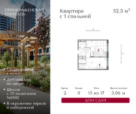 Квартира на 15 этаже в жилом комплексе премиум-класса "Преображенская площадь". Общая площадь: 52.3 кв.м.