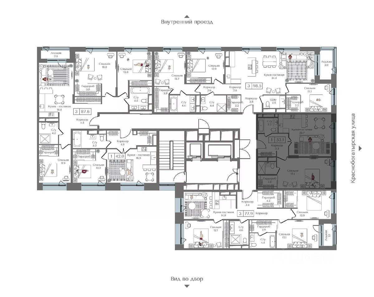 Внутренний двор 1,5 га функциональное и безопасное пространство для игр, работы и занятий спортом. Пешеходный променад для прогулок. Дома переменной этажности. Есть подземный паркинг.