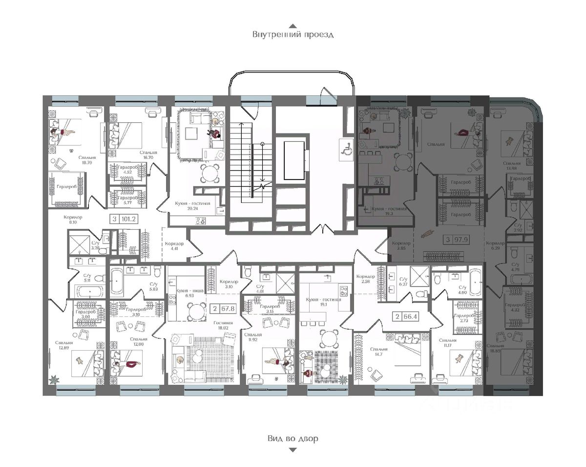 Внутренний двор 1,5 га функциональное и безопасное пространство для игр, работы и занятий спортом. Пешеходный променад для прогулок. Дома переменной этажности. Есть подземный паркинг.