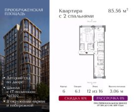 Квартира на 12 этаже в жилом комплексе премиум-класса "Преображенская площадь". Общая площадь: 85.56 кв.м.