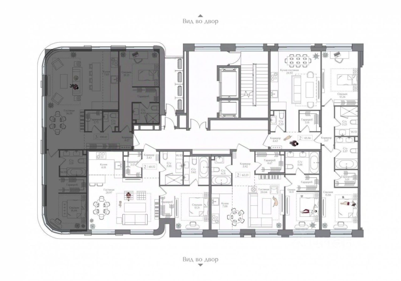 Внутренний двор 1,5 га функциональное и безопасное пространство для игр, работы и занятий спортом. Пешеходный променад для прогулок. Дома переменной этажности. Есть подземный паркинг.