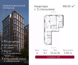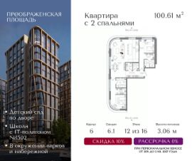Квартира на 12 этаже в жилом комплексе премиум-класса "Преображенская площадь". Общая площадь: 100.61 кв.м.