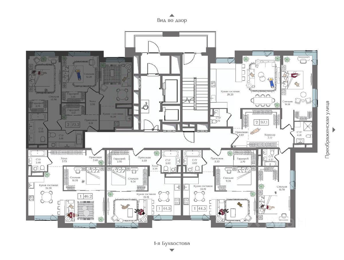 Квартира на 16 этаже в жилом комплексе премиум-класса "Преображенская площадь". Общая площадь: 73.2 кв.м.