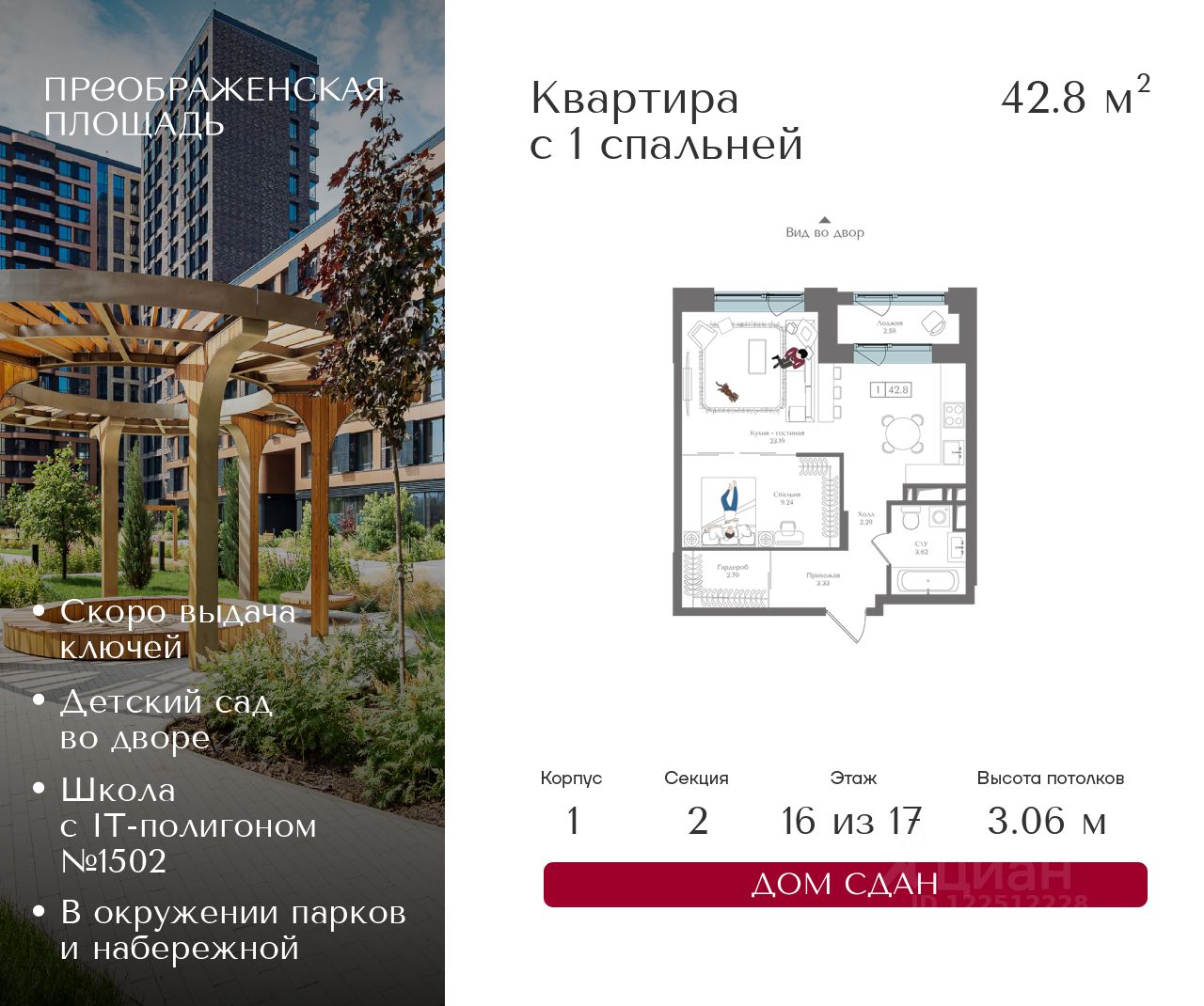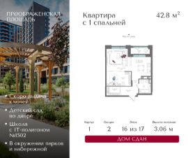 Квартира на 16 этаже в жилом комплексе премиум-класса "Преображенская площадь". Общая площадь: 42.8 кв.м.