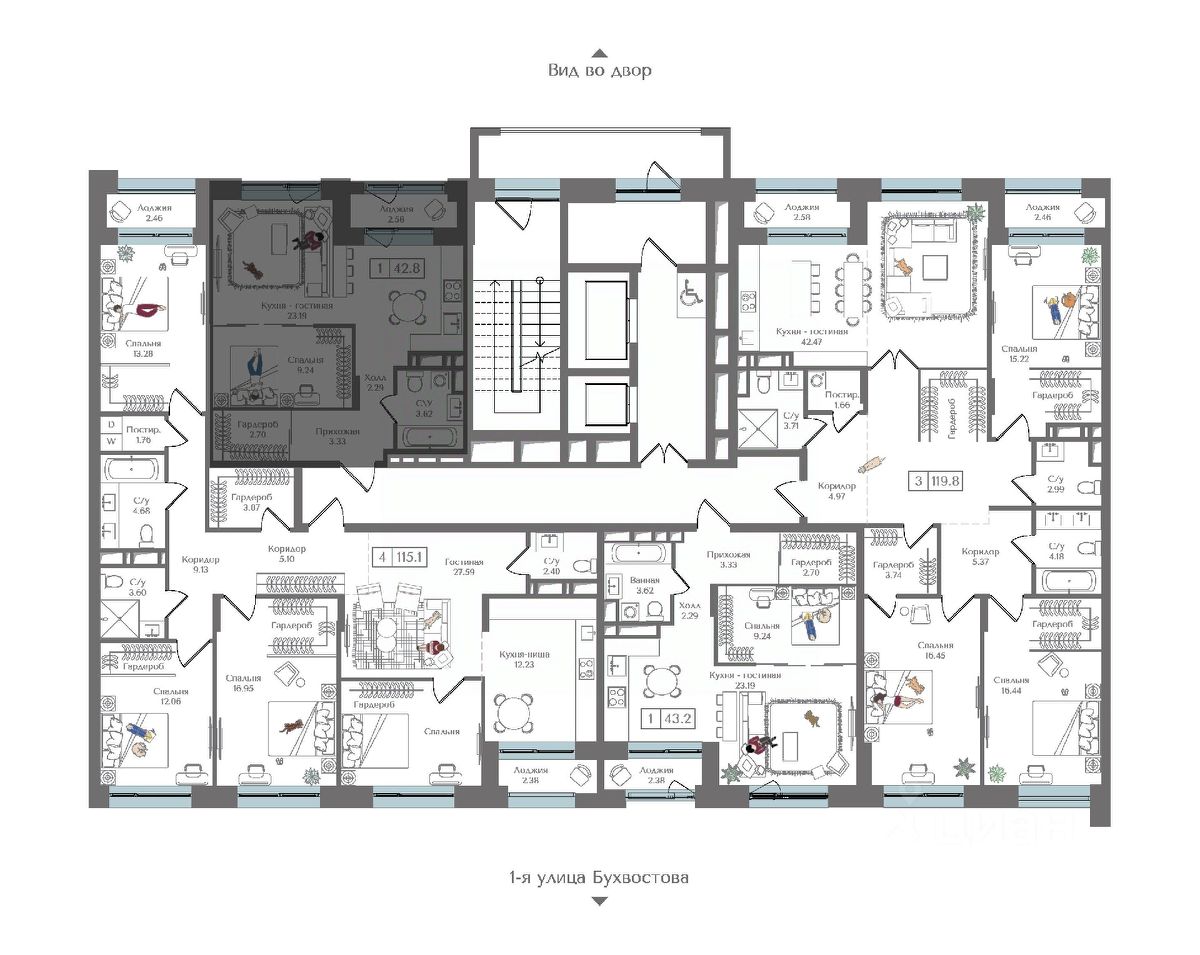 Внутренний двор 1,5 га функциональное и безопасное пространство для игр, работы и занятий спортом. Пешеходный променад для прогулок. Дома переменной этажности. Есть подземный паркинг.