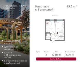Квартира на 12 этаже в жилом комплексе премиум-класса "Преображенская площадь". Общая площадь: 45.5 кв.м. Проект премиум-класса в историческом районе Москвы. До метро "Преображенская площадь" 3 минуты пешком. Квартиры сдаются без отделки и в свободной планировке, чтобы жители могли оформить пространство с учетом своей индивидуальности. Высота потолков от 3,15м, широкоформатное остекление, 3-5 квартир на этаже. Система Умный дом. Дизайнерские лобби. Внутренний двор 1,5 га функциональное и безопасное пространство для игр, работы и занятий спортом. Пешеходный променад для прогулок. Дома переменной этажности. Есть подземный паркинг. Жилой комлекс находится в окружении парков Сокольники, Черкизовский, Измайловский, заповедника Лосиный остров и ВДНХ, а также вблизи пешеходной набережной. Комфортная удаленность от центра: 7 минут на автомобиле до ТТК, 8 минут до Садового кольца, 25 минут до Кремля.