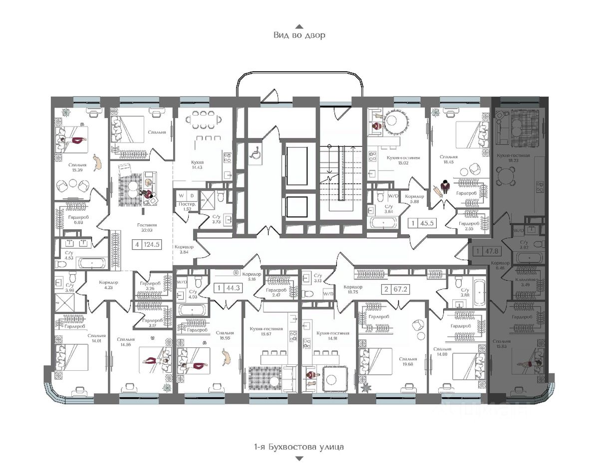 Внутренний двор 1,5 га функциональное и безопасное пространство для игр, работы и занятий спортом. Пешеходный променад для прогулок. Дома переменной этажности. Есть подземный паркинг.