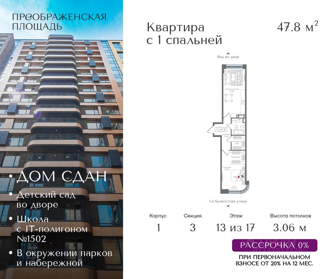 Квартира на 13 этаже в жилом комплексе премиум-класса "Преображенская площадь". Общая площадь: 47.8 кв.м.