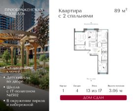 Квартира на 13 этаже в жилом комплексе премиум-класса "Преображенская площадь". Общая площадь: 89 кв.м.