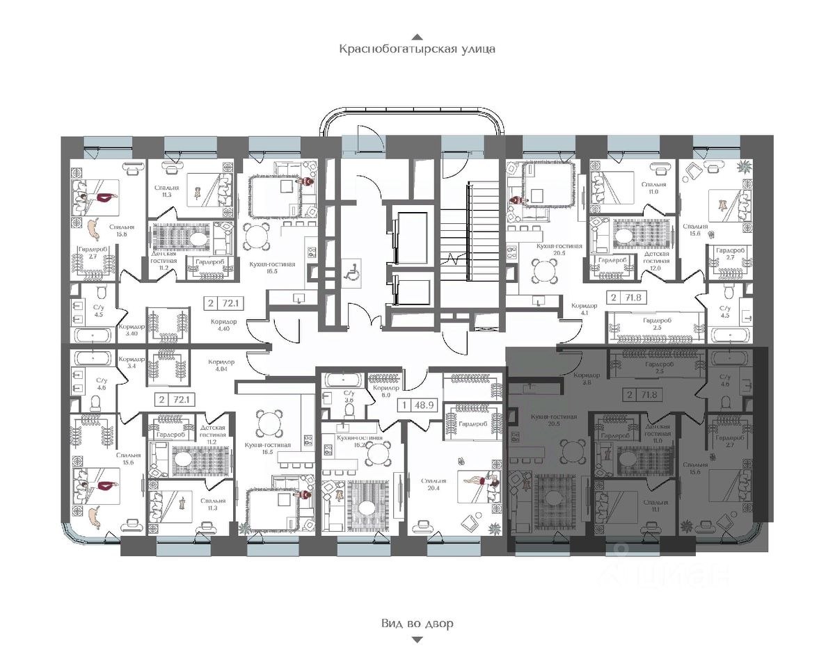 Внутренний двор 1,5 га функциональное и безопасное пространство для игр, работы и занятий спортом. Пешеходный променад для прогулок. Дома переменной этажности. Есть подземный паркинг.