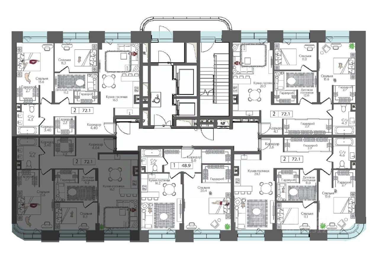 Внутренний двор 1,5 га функциональное и безопасное пространство для игр, работы и занятий спортом. Пешеходный променад для прогулок. Дома переменной этажности. Есть подземный паркинг.