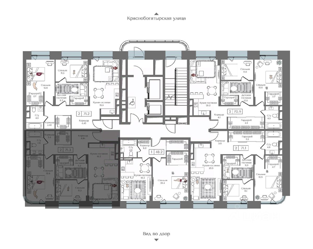 Квартира на 8 этаже в жилом комплексе премиум-класса "Преображенская площадь". Общая площадь: 71.3 кв.м.