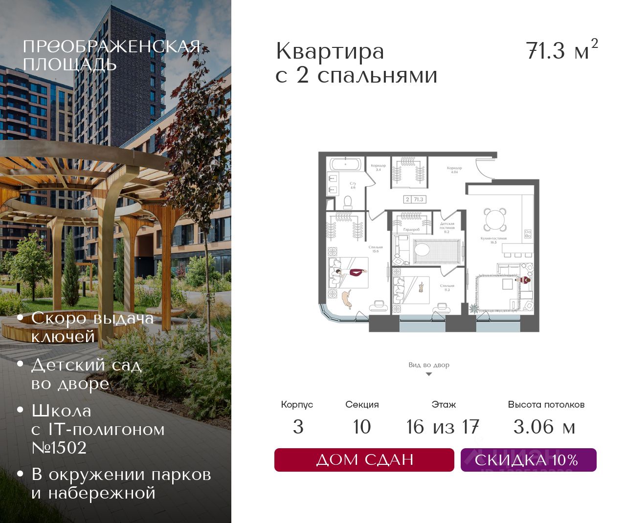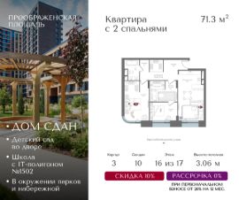 Квартира на 16 этаже в жилом комплексе премиум-класса "Преображенская площадь". Общая площадь: 71.3 кв.м.