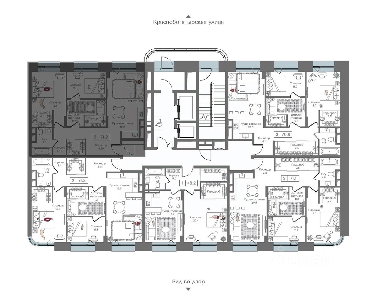 Внутренний двор 1,5 га функциональное и безопасное пространство для игр, работы и занятий спортом. Пешеходный променад для прогулок. Дома переменной этажности. Есть подземный паркинг.
