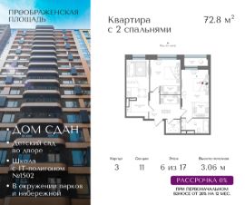 Квартира на 6 этаже в жилом комплексе премиум-класса "Преображенская площадь". Общая площадь: 72.8 кв.м.