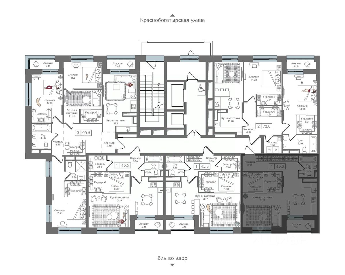 Квартира на 14 этаже в жилом комплексе премиум-класса "Преображенская площадь". Общая площадь: 45.3 кв.м.