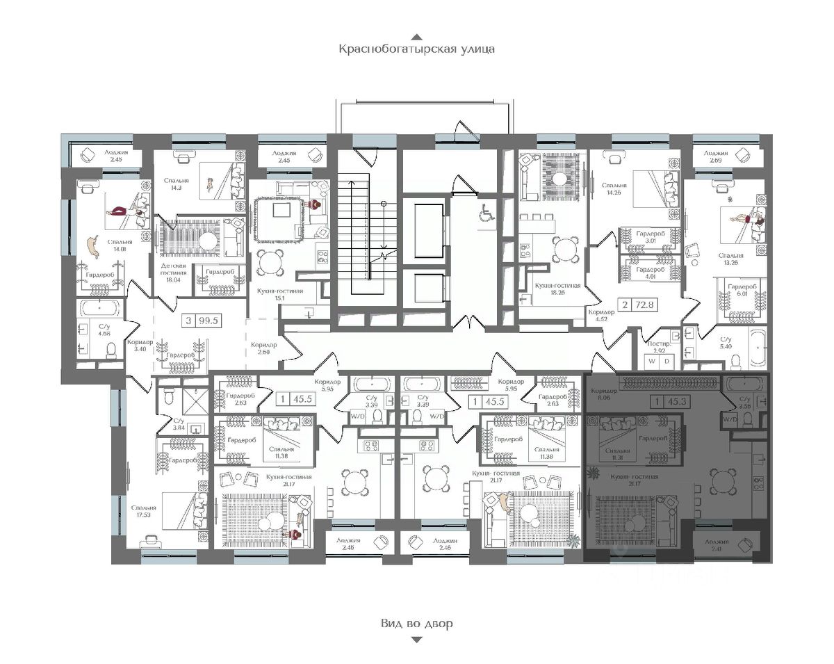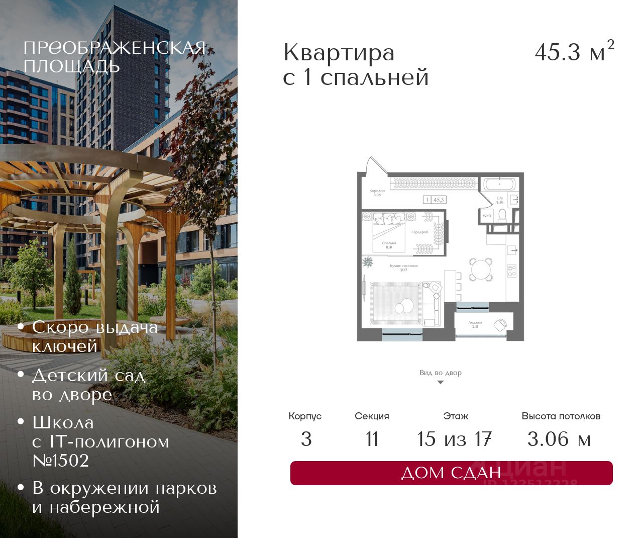 Квартира на 15 этаже в жилом комплексе премиум-класса "Преображенская площадь". Общая площадь: 45.3 кв.м.