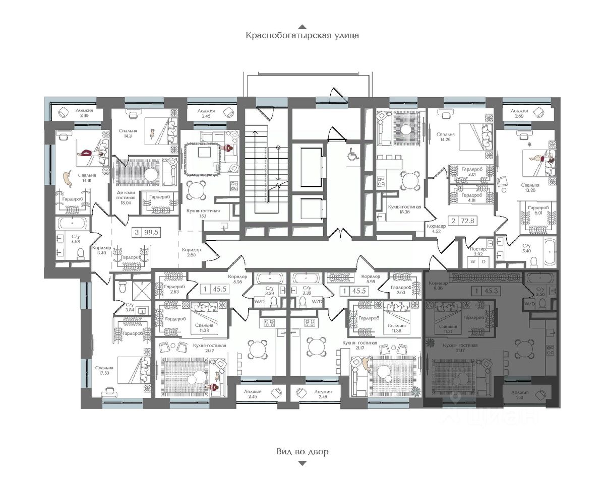Квартира на 17 этаже в жилом комплексе премиум-класса "Преображенская площадь". Общая площадь: 45.3 кв.м.