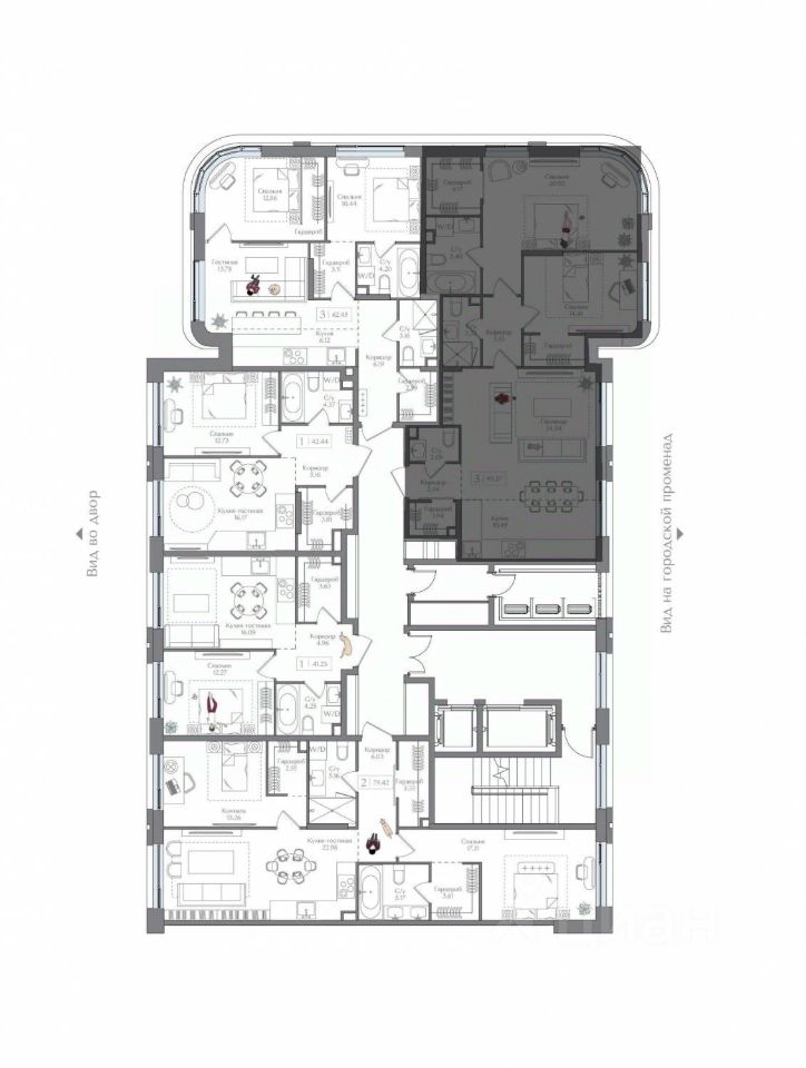 Внутренний двор 1,5 га функциональное и безопасное пространство для игр, работы и занятий спортом. Пешеходный променад для прогулок. Дома переменной этажности. Есть подземный паркинг.