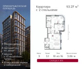 Квартира на 10 этаже в жилом комплексе премиум-класса "Преображенская площадь". Общая площадь: 93.27 кв.м.