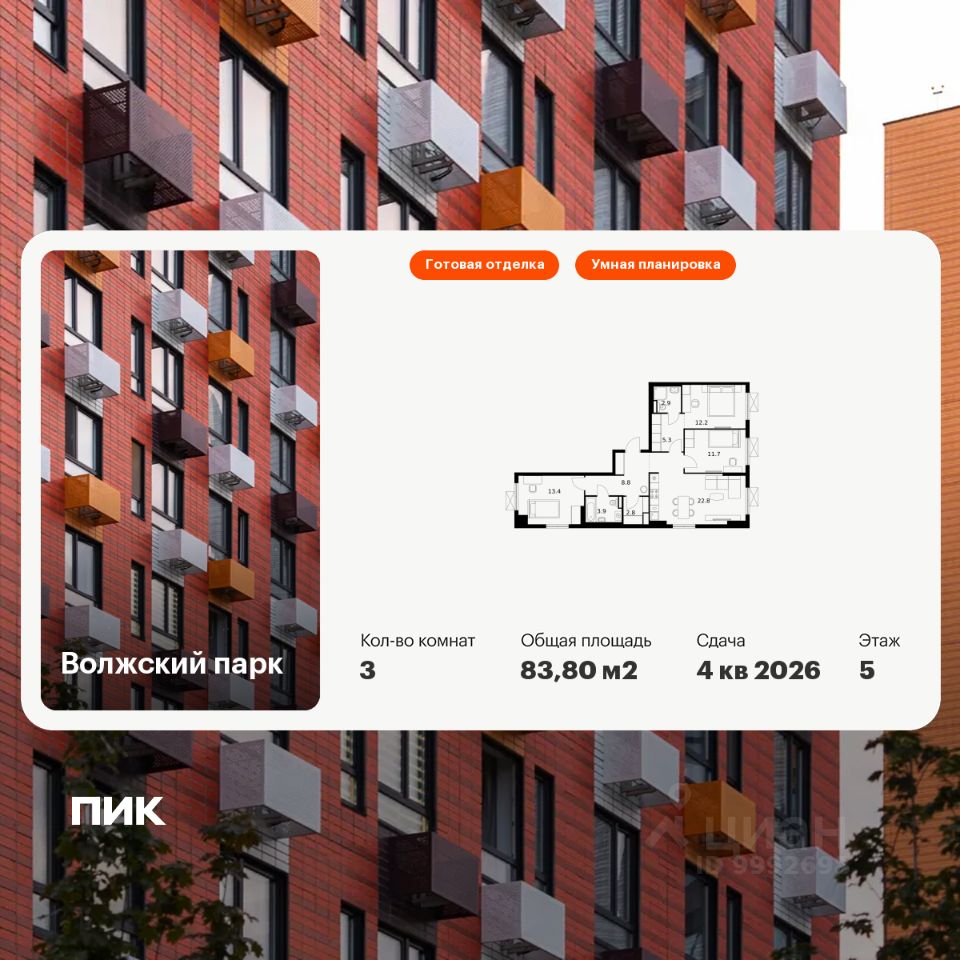 Продаётся 3-комн. квартира площадью 83,8 кв.м на 5 этаже 24 этажного дома (Корпус 6.2, Секция 2) проекта ПИК Волжский парк. Светлый просторный подъезд на уровне земли, функциональная планировка, большие окна, c отделкой.