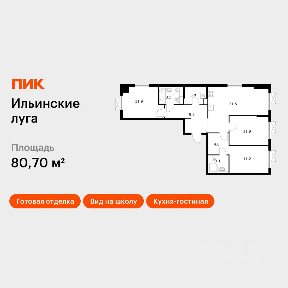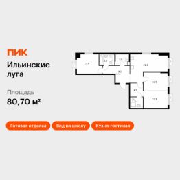 Продаётся 3-комн. квартира площадью 80,7 кв.м на 3 этаже 9 этажного дома (Корпус 2.13, Секция 2) проекта ПИК Ильинские луга. Светлый просторный подъезд на уровне земли, функциональная планировка, большие окна, c отделкой.