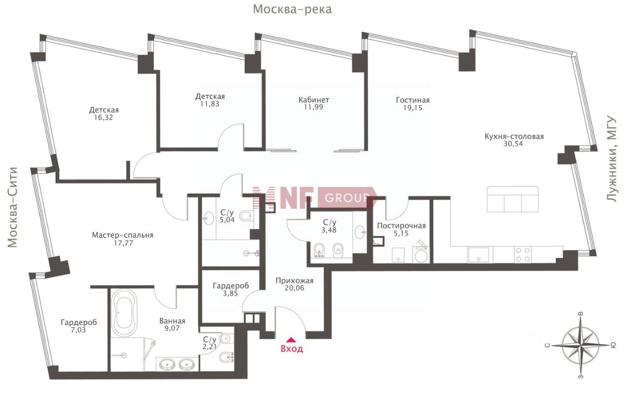 Планировка свободная, оптимальный вариант организации пространства: гостиная с зоной кухни-столовой, мастер-спальня с ванной комнатой и гардеробной с окном, две детские с ванной комнатой, кабинет (гостевая спальня), гардеробная, гостевой санузел.