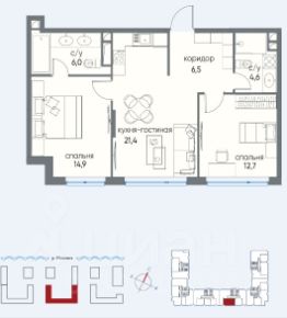 Жилая площадь составляет 27.6 квадратных метров, а кухня — 21.4 квадратных метра, что позволяет комфортно разместиться всей семье. В квартире более одного санузла, что добавляет удобства при использовании.