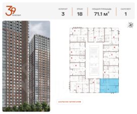 Продается трехкомнатная квартира в ЖК "Проспект 39" по адресу Москва, ЮВАО, Рязанский проспект, вл. 39, к. 2. Общая площадь квартиры - 71,10 кв.м., этаж 25. Стоимость квартиры - 24 601 488 р. Продаётся без отделки.