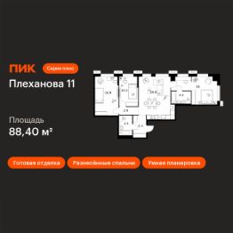 Продаётся 3-комн. квартира площадью 88,4 кв.м на 15 этаже 24 этажного дома (Корпус 1.1, Секция 1) проекта ПИК Плеханова 11. Светлый просторный подъезд на уровне земли, функциональная планировка, большие окна, c отделкой.