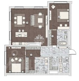 Планировкой предусмотрено: просторная кухня-гостиная с зоной столовой, 2 спальни, каждая из которых со своей ванной и гардеробной; отдельная кладовая/постирочная.