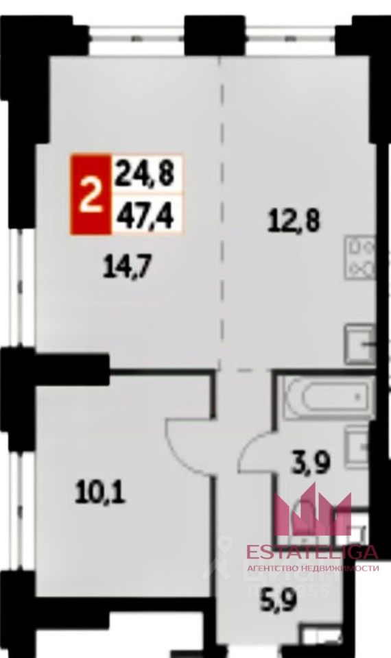 Удачная планировка квартиры: просторная кухня-ниша 12,8 м², две изолированные комнаты 14,7 м², 10,1 м², совмещённый санузел 3,9 м², прихожая 5,9 м².