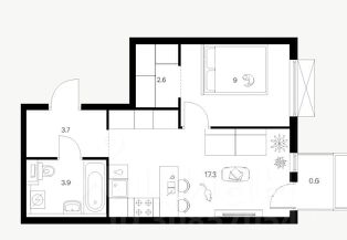 Общая площадь квартиры - 37,1м² (кухня-гостиная 17,3м², спальня 11,6м² (9+2,6), С/У 3,9м², прихожая 3,7м², балкон 0,6м².