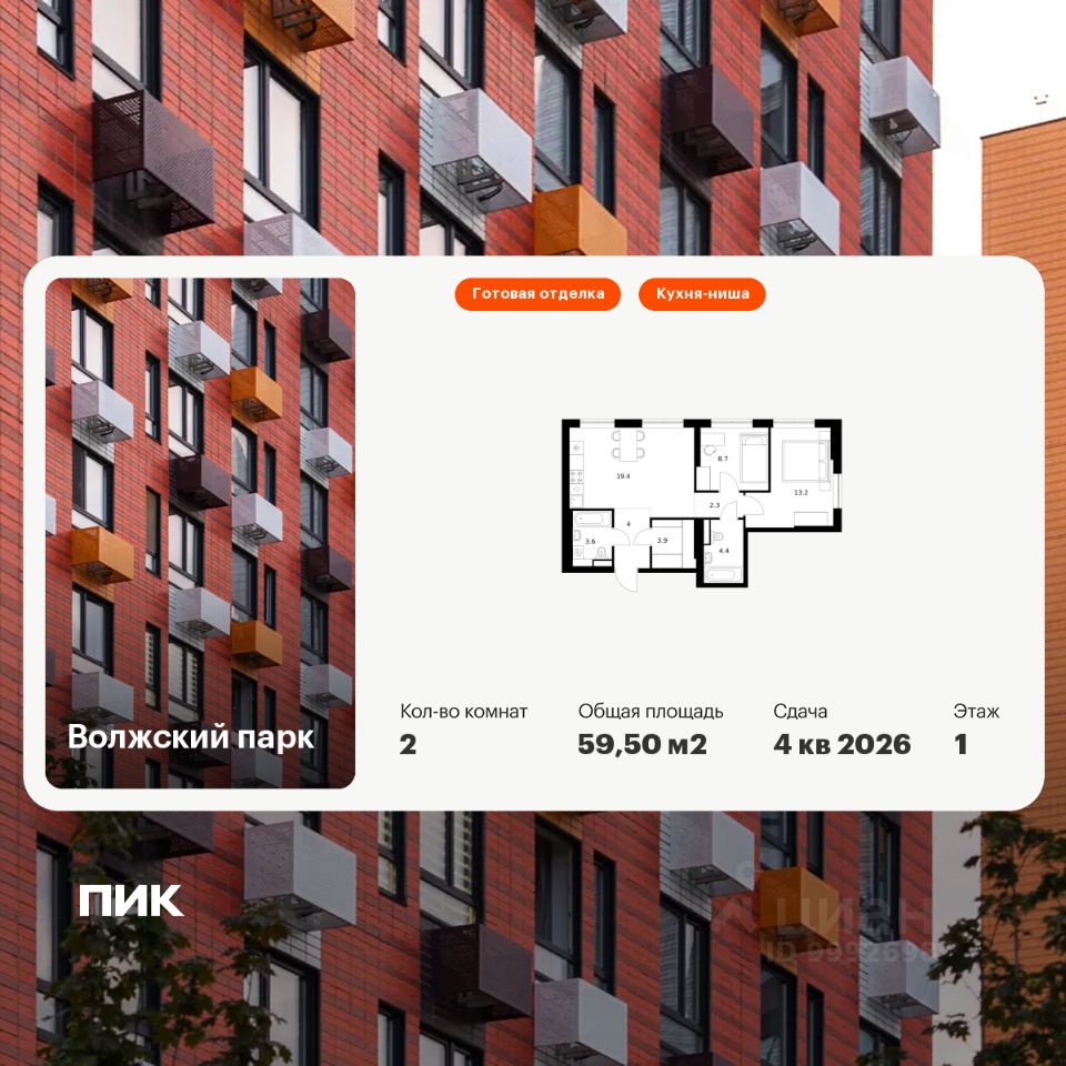 Продаётся 2-комн. квартира площадью 59,5 кв.м на 1 этаже 24 этажного дома (Корпус 6.2, Секция 1) проекта ПИК Волжский парк. Светлый просторный подъезд на уровне земли, функциональная планировка, большие окна, c отделкой.