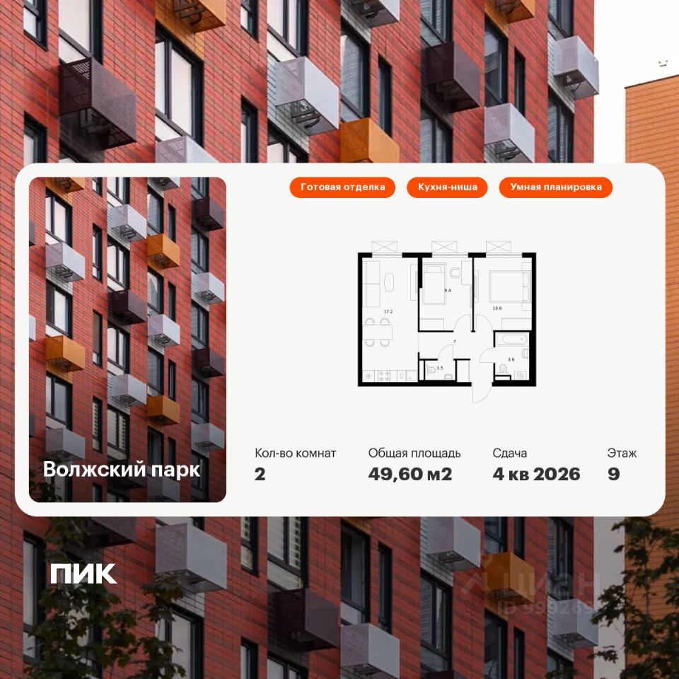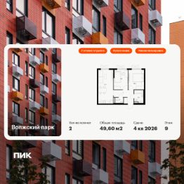 Продаётся 2-комн. квартира площадью 49,6 кв.м на 9 этаже 24 этажного дома (Корпус 6.2, Секция 1) проекта ПИК Волжский парк. Светлый просторный подъезд на уровне земли, функциональная планировка, большие окна, c отделкой.