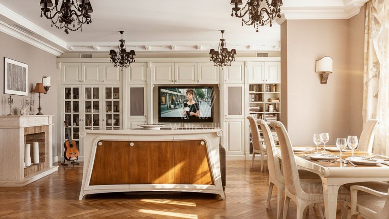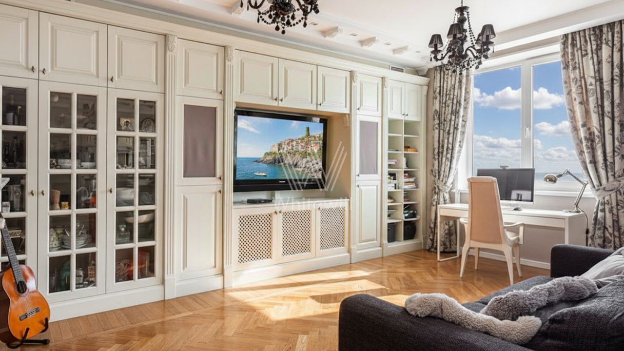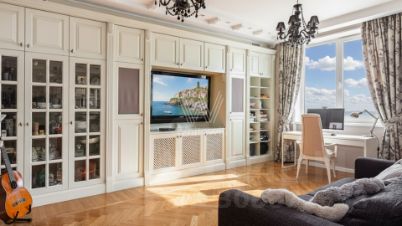 Функциональная планировка: гостиная 44 м² со столовой зоной, кухня 20 м² с островом, мастер-спальня 20 м² с гардеробной 4 м², санузел 18 м² с сауной и джакузи, детская спальня 20 м², гостевая спальня 17 м², просторный холл 28 м², гостевой санузел. Все спальни выходят на застекленную лоджию площадью 12 м². Выполнен дизайнерский ремонт с использованием премиальных материалов: дубовый паркет, столешница из мрамора, плитка Emperador, тиковое дерево, ванна в мраморных слэбах с отделкой деревянными панелями и плинтусами, душевая кабина из мрамора. Установлена сплит-система кондиционирования, на кухне встроенная техника Miele, в холле — встроенные шкафы, библиотека. Из окон открываются виды на две стороны света: на парк Ходынское поле с прудами и панорамный вид в сторону Сити и парка Березовая роща. Есть возможность арендовать парковочное место в подземном, охраняемом паркинге.
