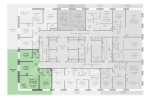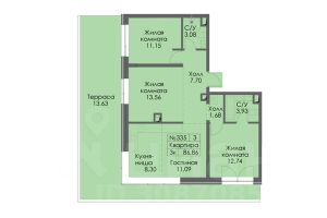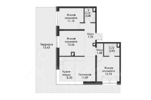 Удобная планировка включает просторную кухню-гостиную с угловым остеклением; три отдельных комнаты, в одной из которых расположена собственная ванная комната; и конечно собственную террасу площадью 13,63 м.кв, огибающую всю квартиру по периметру.