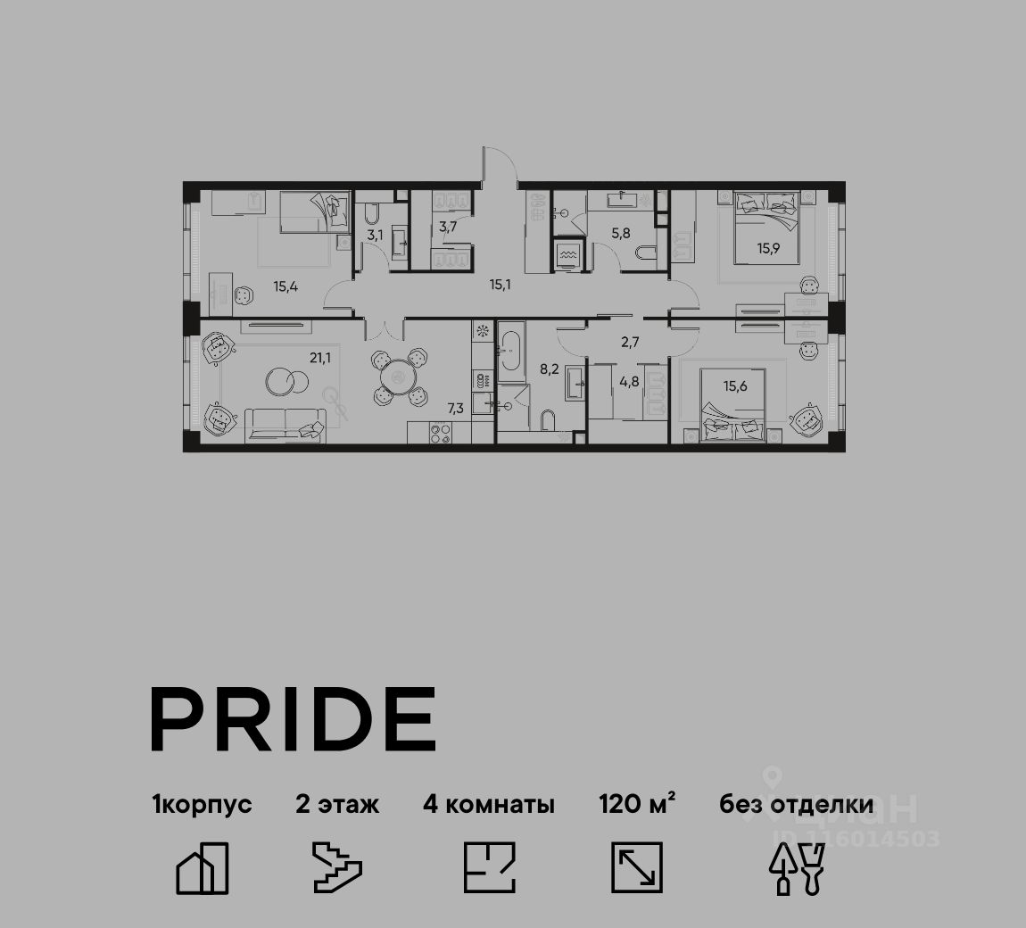 В премиальном жилом квартале PRIDE продается 4-комнатная квартира в 1 корпусе, на 2 этаже, в секции 5. Её общая площадь составляет 120 м². Пространство включает 3 уютные спальни 15,4 м², 15,9 м², 15,5 м², просторную кухню-гостиную 28,4 м² и 2 ванные комнаты 8,2 м² и 5,8 м². Ключи в 2026 году.