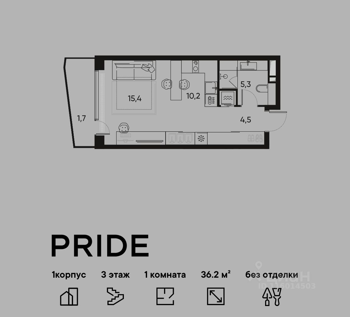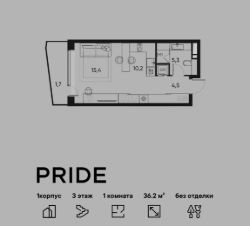 В премиальном жилом квартале PRIDE продается 1 - комнатная квартира - студия в 1 корпусе, на 3 этаже, в секции 10. Её общая площадь составляет 36.2 м². Пространство включает зону для отдыха 15,4 м², уютную кухню 10,2 м², и ванную комнату 5,2 м². Ключи в 2026 году.